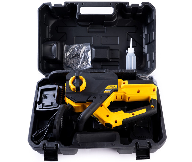 - Два акумулятори в комплекті дають змогу пиляти без перерв, чергуючи заряджання та використання.