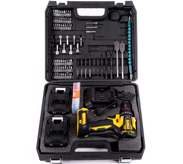 У наборі понад 85 насадок: біти, свердла, торцеві головки, гнучкий подовжувач, а також пластиковий контейнер із дюбелями та саморізами. Все зручно розкладено для швидкого доступу.